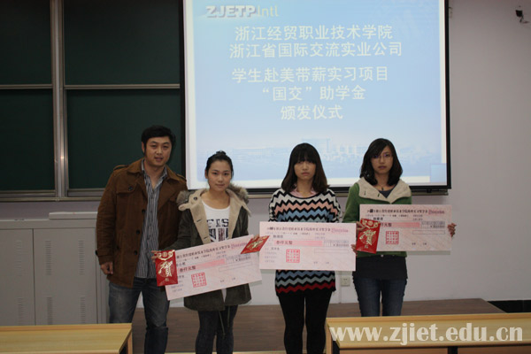 2011年,我院和浙江外服 SWT项目办公室联合推出了有关“2011年大学生暑期赴美带薪实习”的项目。为鼓励我院学生积极参加该项目,浙江外服与浙江省国际交流实业公司特设“国交”助学金以表彰和奖励品学兼优的学生。我院国际贸易系中美合作专业09级学生颜晨瑾、乐小君、陈佩佳参加了该项目,成功赴美,在美国工作期间表现优异,获得了雇主以及员工的一致称赞。三位同学各获得了3000元助学金。