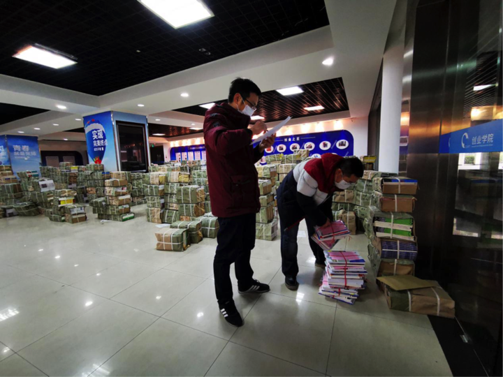 在学校图信中心、总务处等有关部门的大力支持下,班子成员亲自到图书馆整理教材、打包核对,将一份份沉甸甸的“干货”送到快递员手上,送到邮政网店。
