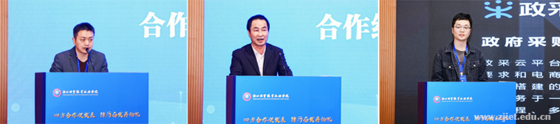 浙江省兴合集团有限责任公司、杭州西湖风景名胜区资产经营集团有限公司、政采云有限公司三家合作企业的代表在会上进行了校企合作经验交流。